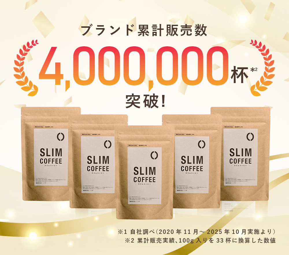 SLIM COFFEEは累計販売数4,000,000杯を突破している超実力派のダイエットコーヒーなんです! 「無理なく続けられる」「好きなものを我慢しなくていい」などSNSでも話題に…!