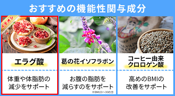 ※1 本製品に含まれるエラグ酸(機能性関与成分)が、肥満気味な方の体重・体脂肪、お腹まわりの脂肪の減少を助ける。